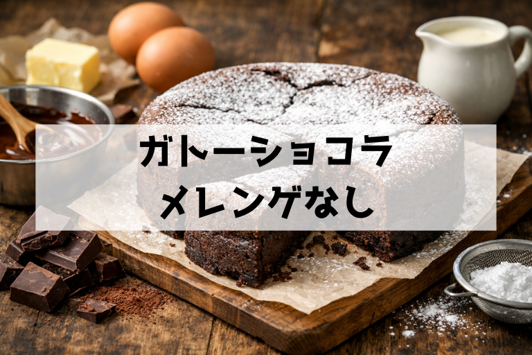 メレンゲを作らないガトーショコラは、工程が短くて気軽に作れます。ただし、メレンゲが担っていた「空気の層」がなくなるので、仕上がりはどっしりしやすく、焼き加減もシビアになります。メレンゲなしでおいしくするコツは、軽さを卵黄側で補う意識を持つことです。たとえば卵をしっかり溶き、砂糖を加えて少し白っぽくなるまで混ぜると、ある程度空気が入り生地がなめらかになります。ここで混ぜが足りないと重くなり、混ぜすぎると泡が潰れて意味がなくなるので、ツヤが出て流れがゆっくりになる程度を目安にします。粉は入れた瞬間からグルテンが出やすいので、振るってから加え、さっくり短時間で混ぜます。焼くときは「中心は少しだけ柔らかい」を狙い、粗熱が取れてから冷やすと、口どけが落ち着いてしっとりが出ます。メレンゲなしは失敗しないというより、狙う食感が変わる作り方です。向いている配合や注意点は、こちらで詳しく紹介されています。